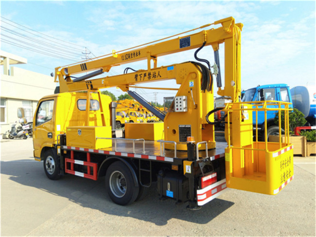 專用配置:東風高空作業車作業高度為18米,液壓360度全回轉,三節折疊臂,單液壓舉升缸,帶雙向平衡閥,電控操作舉升臂,四支液壓油缸可調式支腿帶雙向液壓鎖(支腿操作為手動操作,可單獨控制),帶1噸吊鉤.帶應急動力單元。最大作業幅度約7米,最大起吊高度8米。